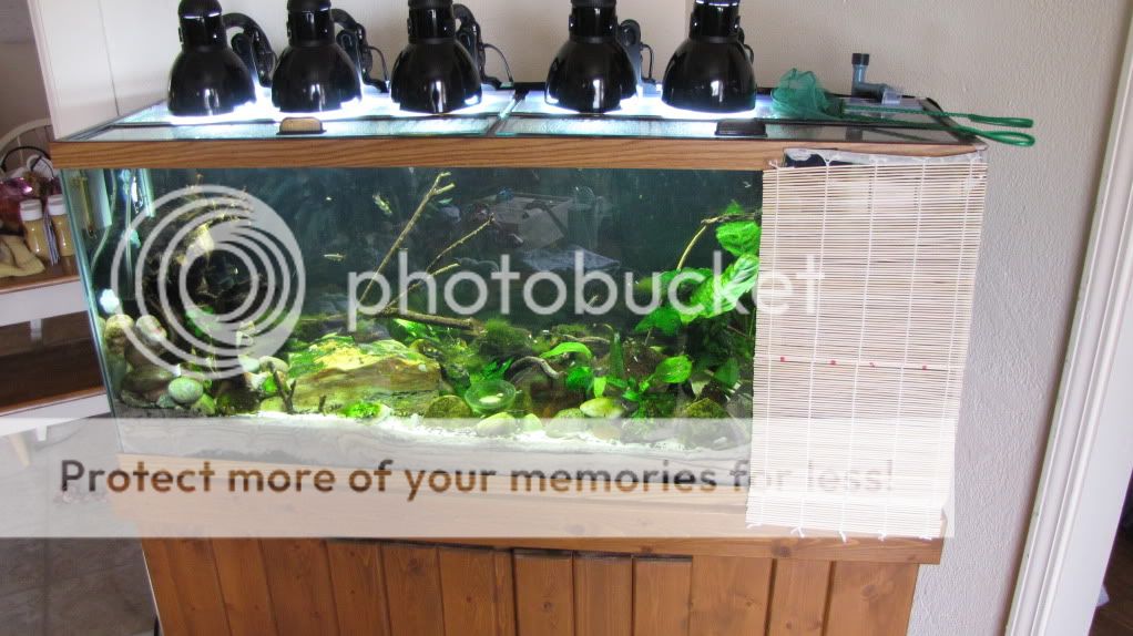 FTS: Sorry about the glare. You can see the addition of the driftwood on the left to cover the powerheads and provide another grazing area. Also, the bamboo stuff on the right it Platy's idea. I'm quite grateful for it! I'll secure it better with some black electrical tape shortly. Finally, I added a fifth light. Sorry about the glare and the mess! It's not exactly a careful shot, aesthetically.