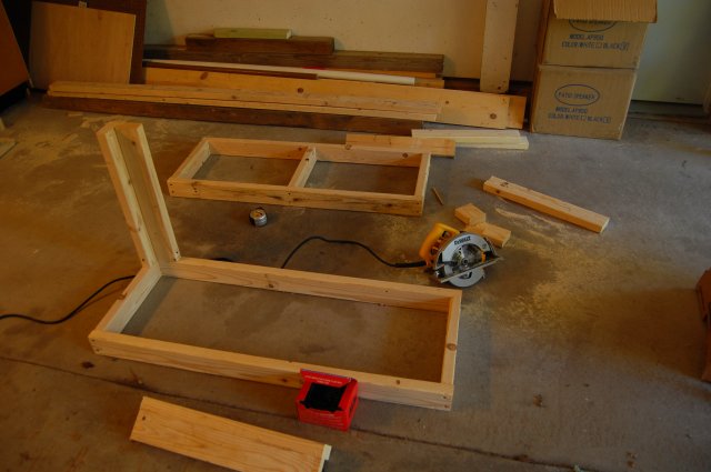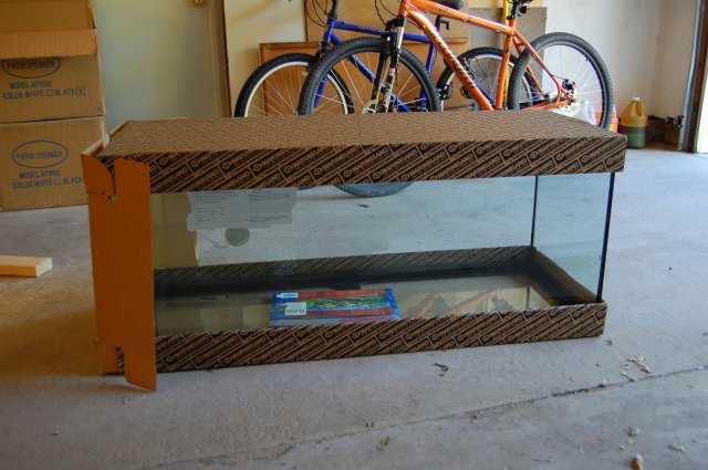 I've got some pictures for those of you that are following. I built my stand this afternoon. When we bought our new house, there were a ton of 2x4's, 4x4's, 6x1's, and various plywood that was left behind, so I built this stand for the price of a box of 3" wood screws (although I had already purchased them for a previous project). So here's some pics of the stand and tank. I'll be running to Menards in the next few days for some birch plywood to finish it, as well as some trim and a couple doors.
