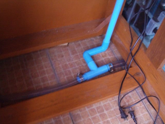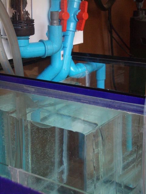 Another problem was a seal leaking on the front connection between the two tanks. Since changing water is going to be done by tap water in the equipment-sump and draining from the filter-sump, I thought better to put a valve between the two so that there's no 'bleeding' in the process and it'll speed up the water-changing. So, seal-leak solved, valve in-between, reconnected and water-proof this time.