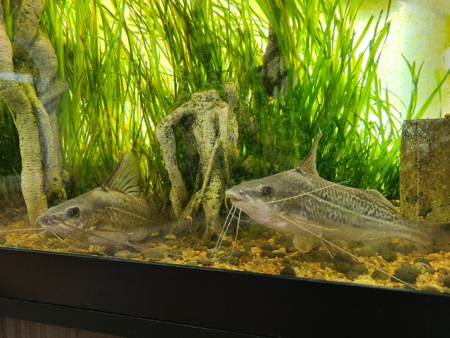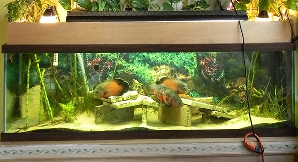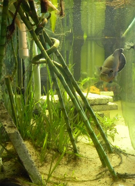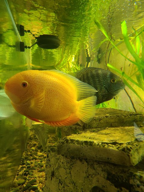 The cichlid tank is stocked with 8 silver dollars of two different varieties. 1 mature gold severum and one mature green severum. There are also two 12" pictus cats. There is always a pleco.